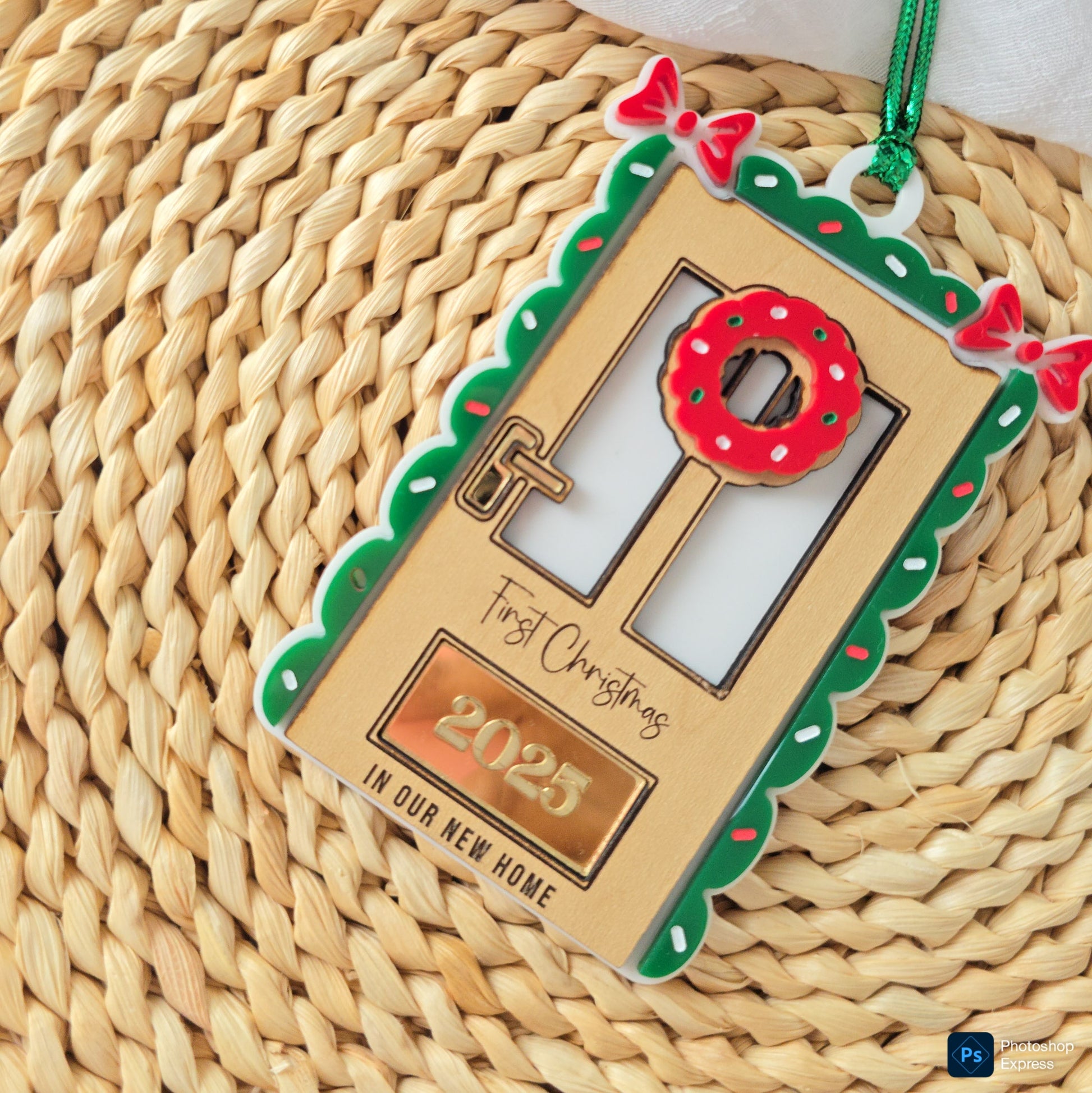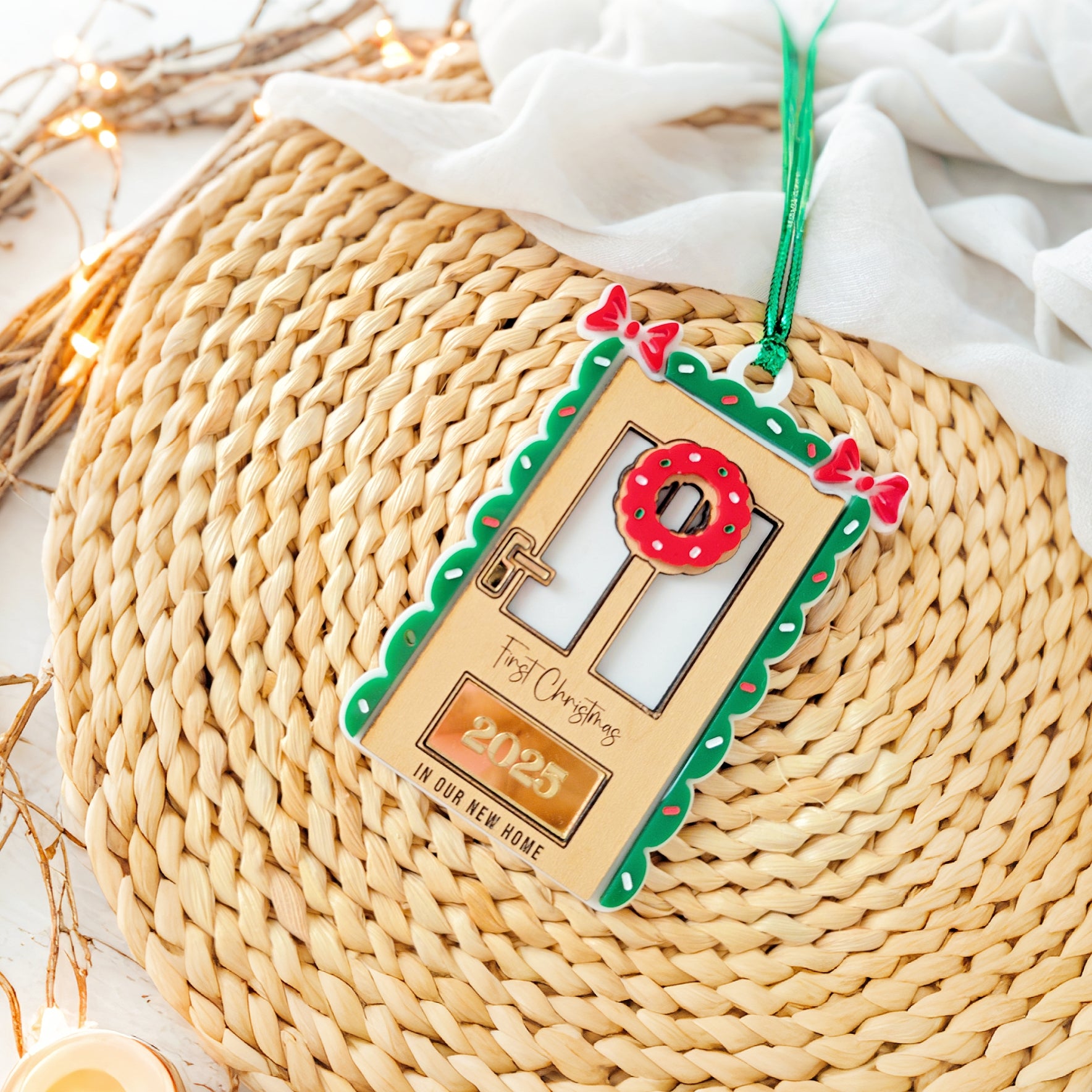 Commemorate a special milestone with this charming New Home Christmas Ornament. Featuring a festive holiday door design with gold accents, it’s the perfect personalized gift for couples, families, or new homeowners celebrating their first Christmas in a new house.